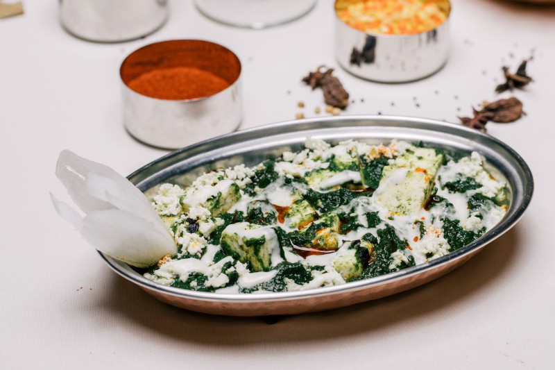 Royal India’s Chicken Kolapurii and Palak Paneer (Left)